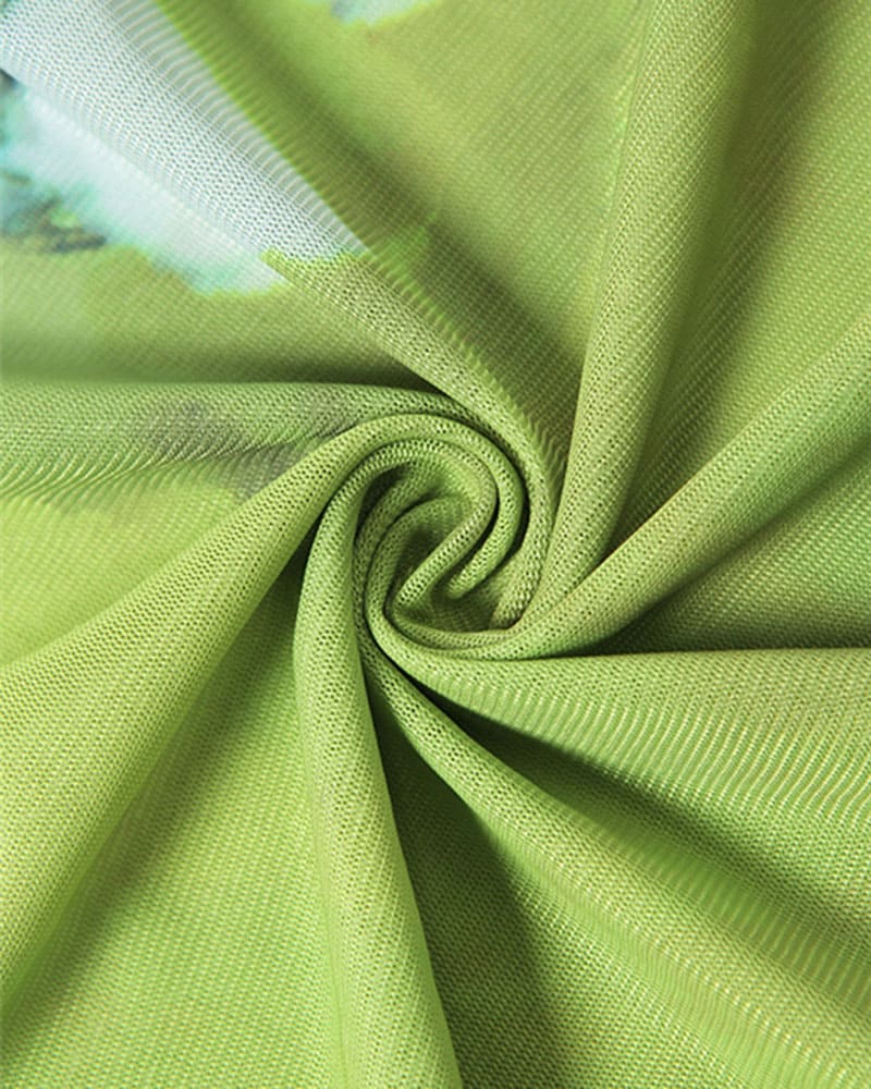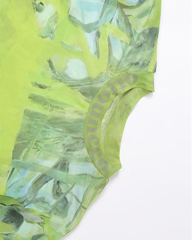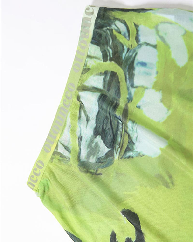 Details: Green abstract pattern mesh coord. with matching crop top and mini skirt