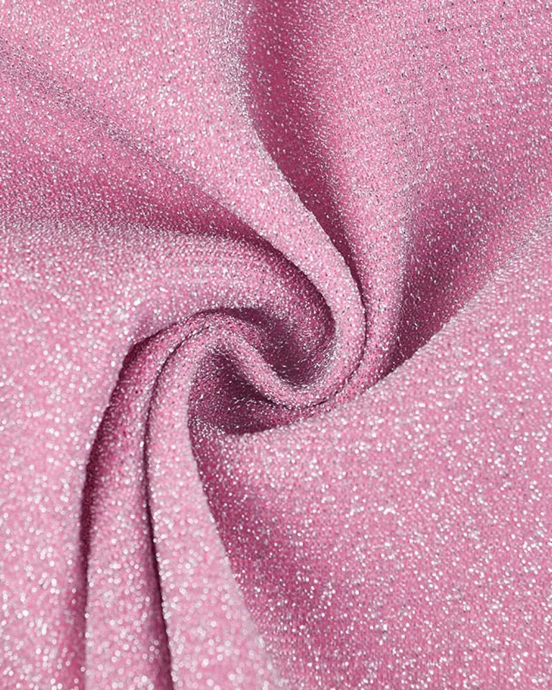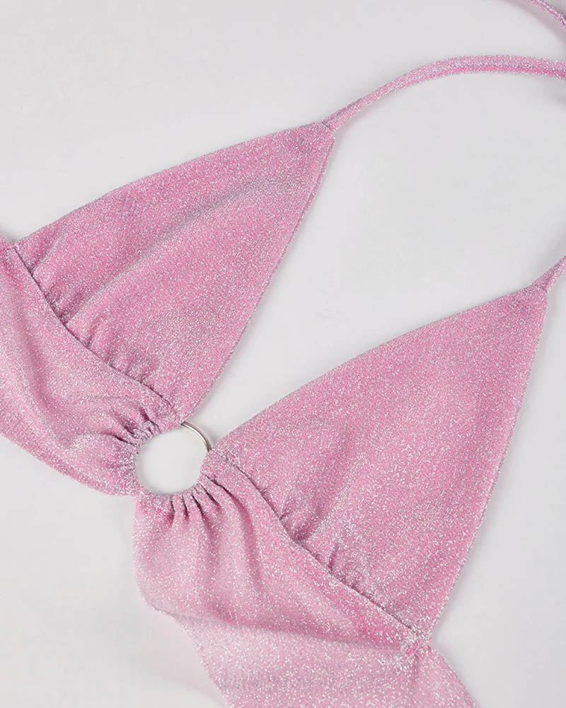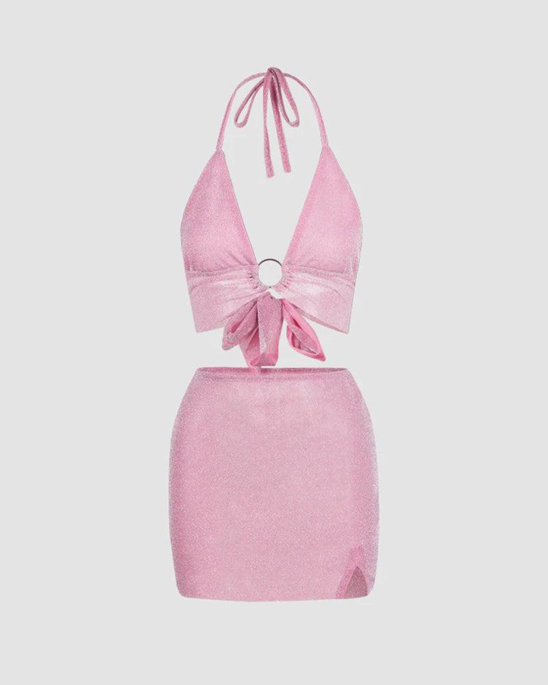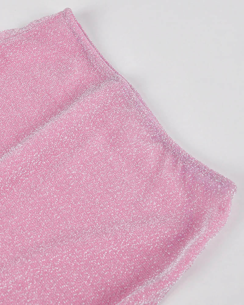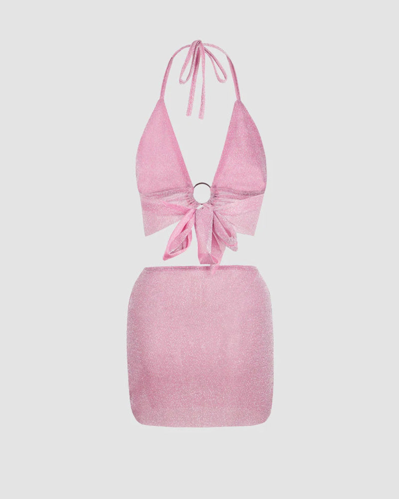 Details: Pink sparkling meshed coord set with see-through design. coming with a sleeveless top with ring details at front. and short skirt with side slit