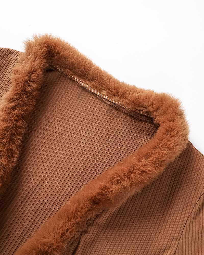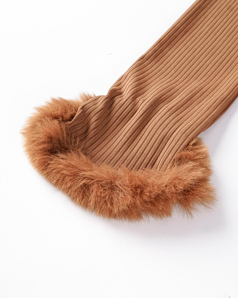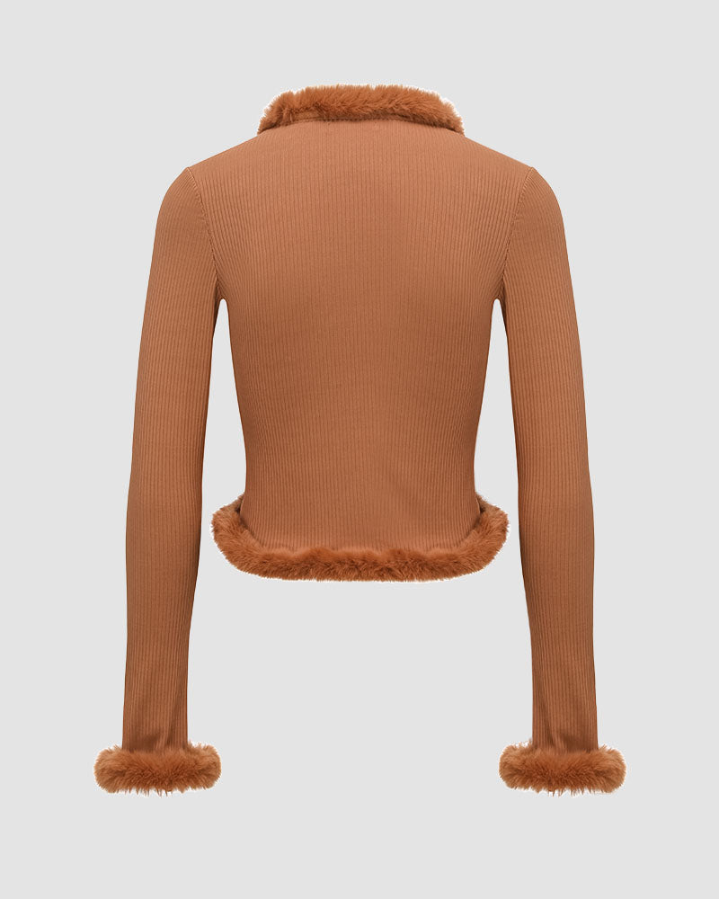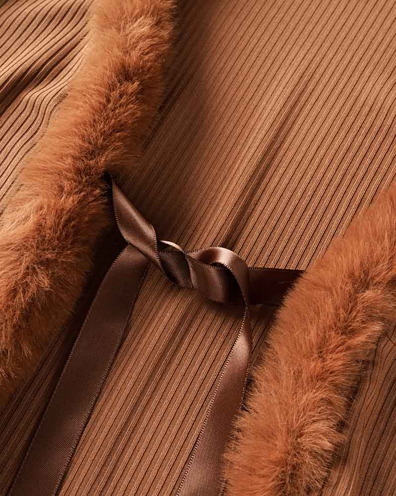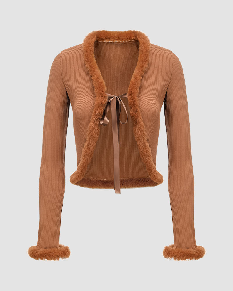 Details: Long-sleeve cardigan with fuzz details and front ribbon design