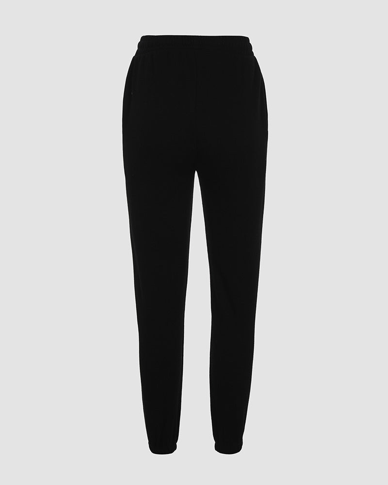 Details: High waisted joggers with elastic hem and smiley face detail print