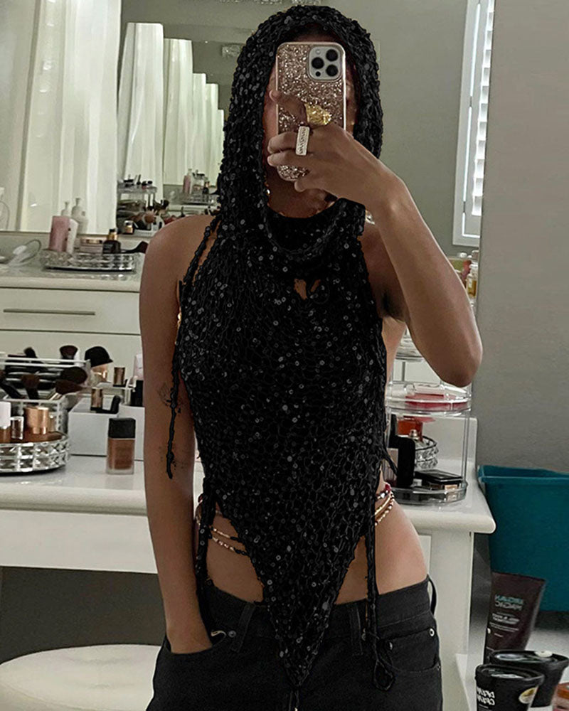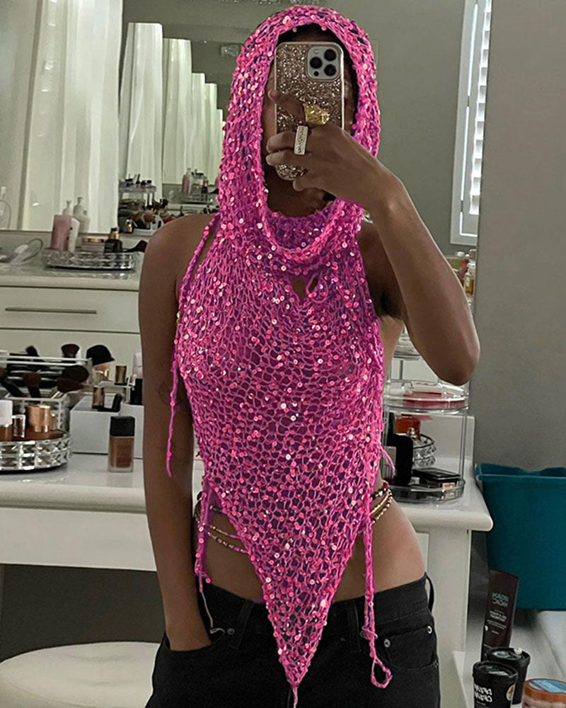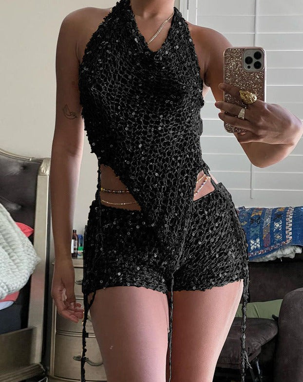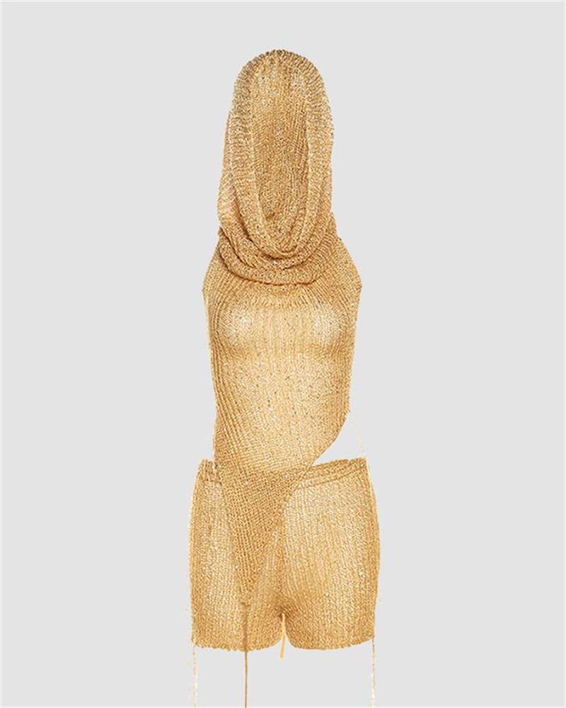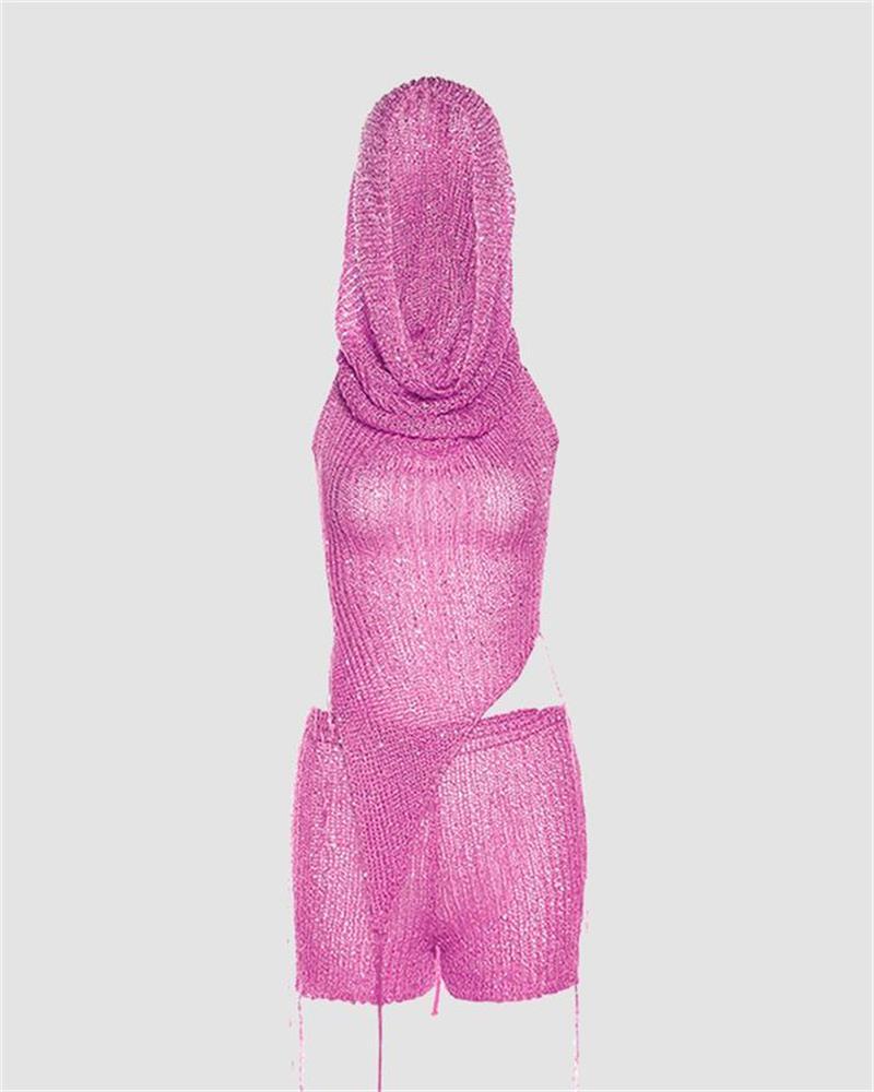Details: Glimmering coord set. coming with sleeveless hoodie top and shorts