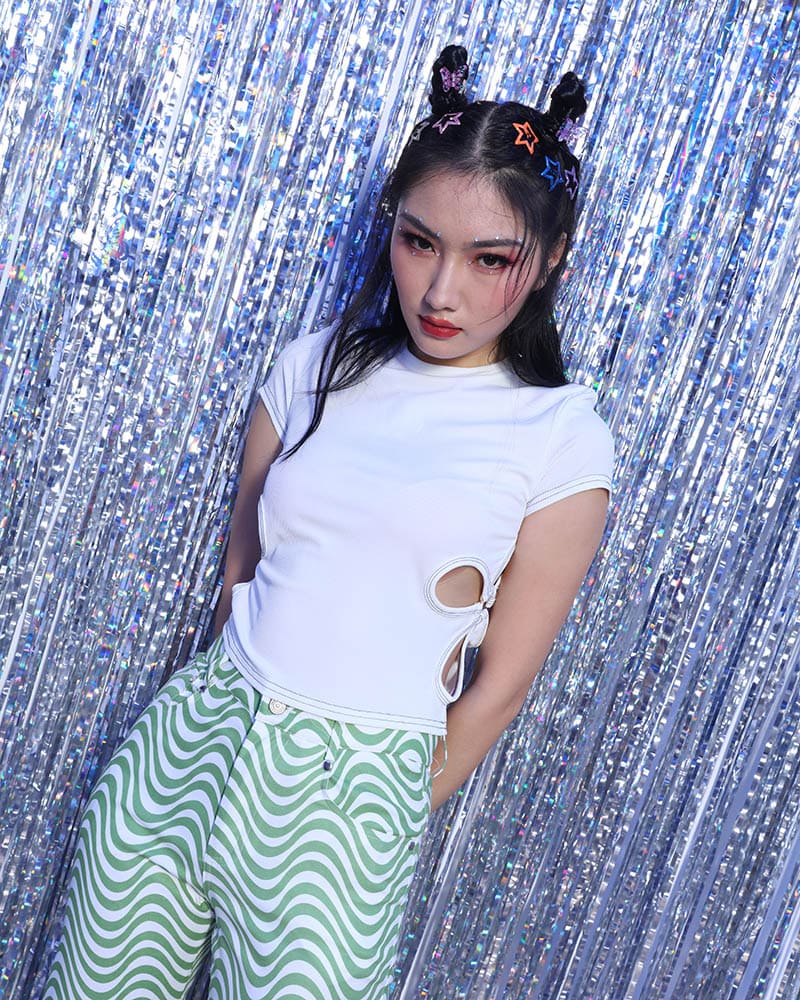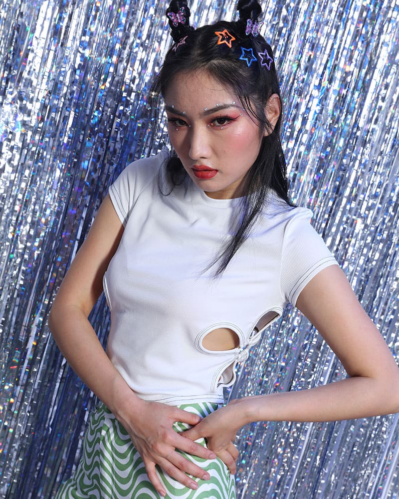 Details: Ribbed short-sleeve top with four-leaf clovers cutout at sides