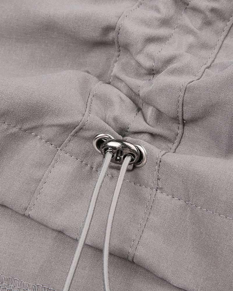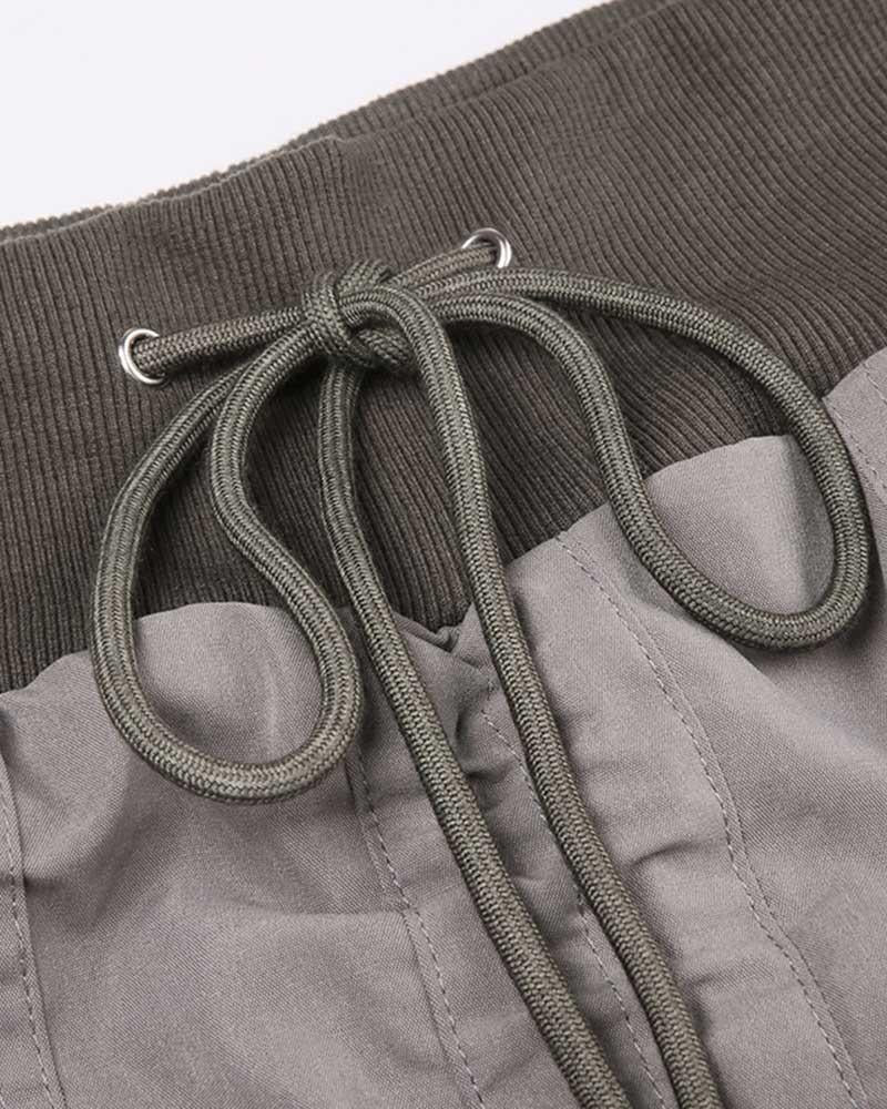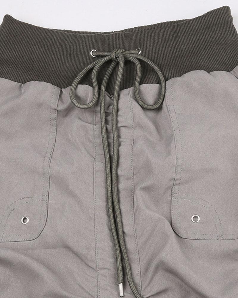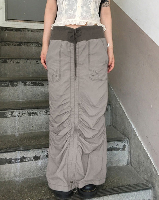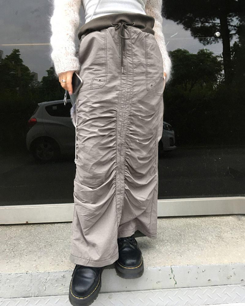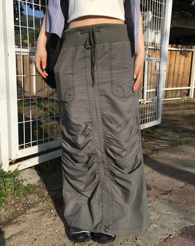 Details: Maxi cargo skirt with front ruffled design and drawstring details
