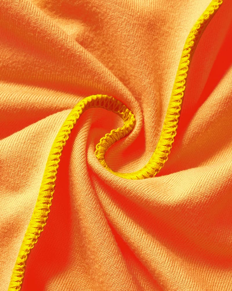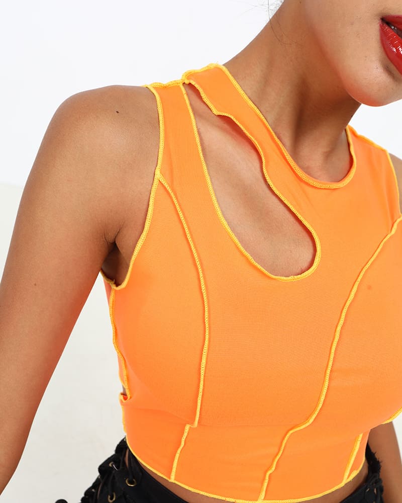 Details: Orange sleeveless top piece with chest cut-out and patch style pattern