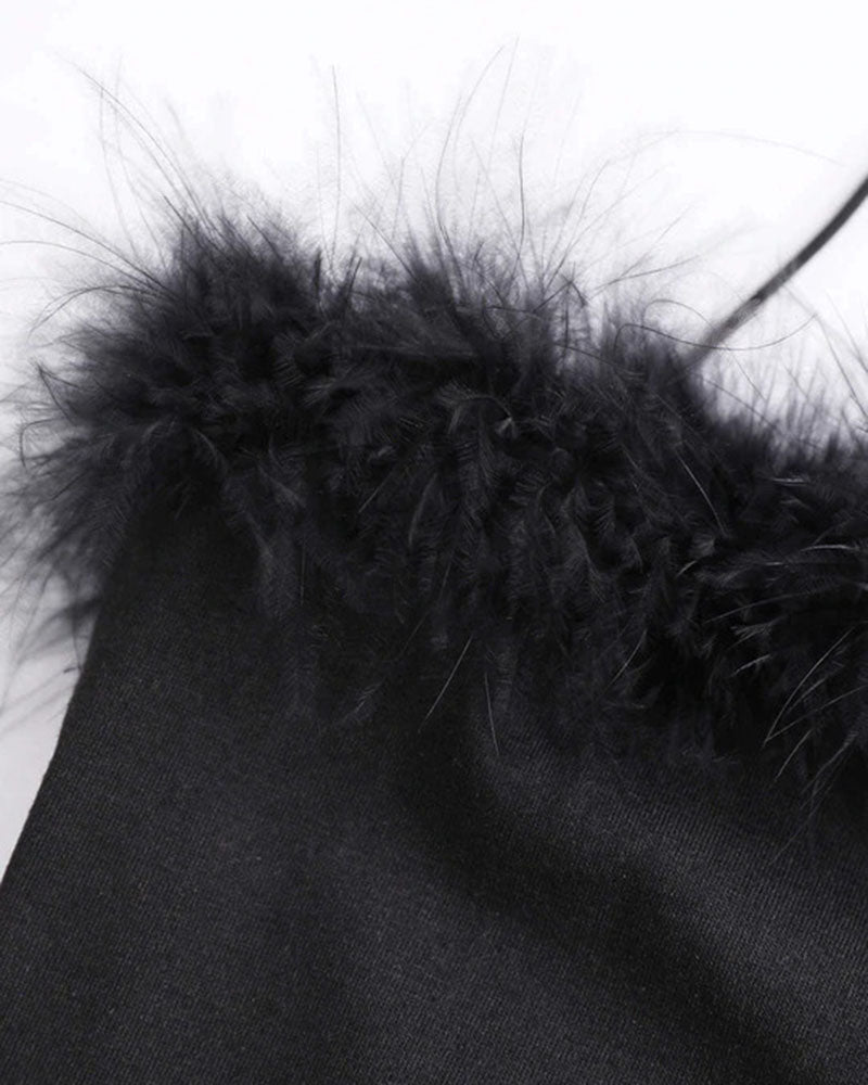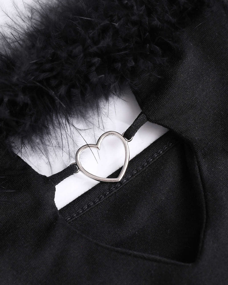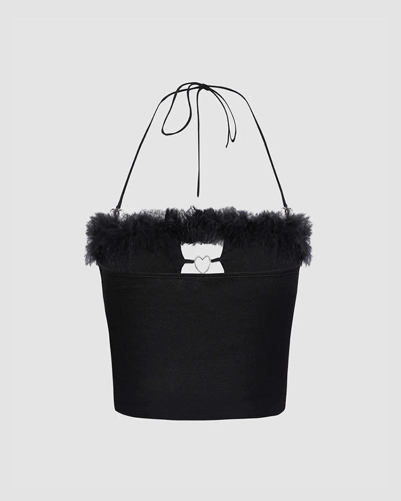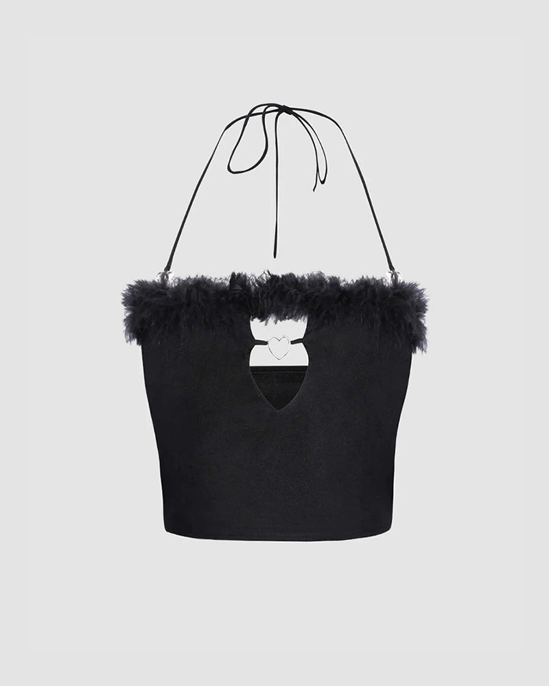 Details: Halter top with fuzz design. front cut-out and heart-shape metallic details
