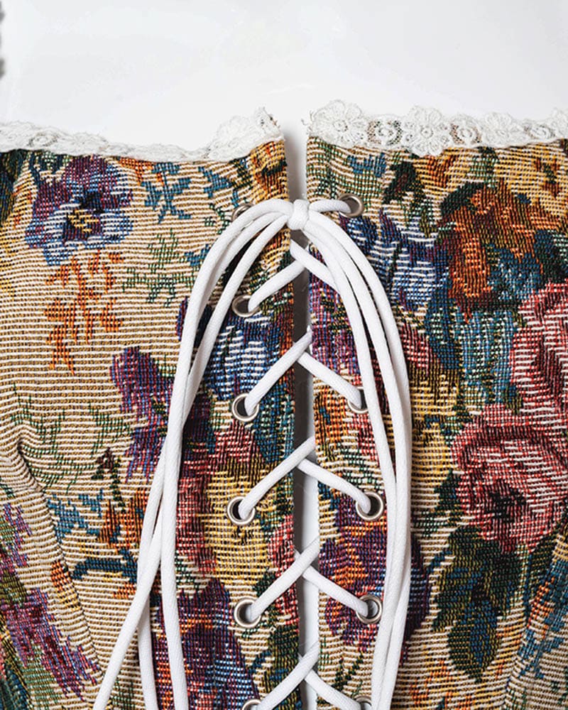 Details: Floral print corset top with front ribbon details and lace design