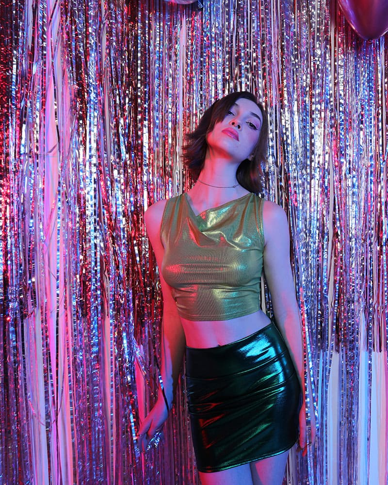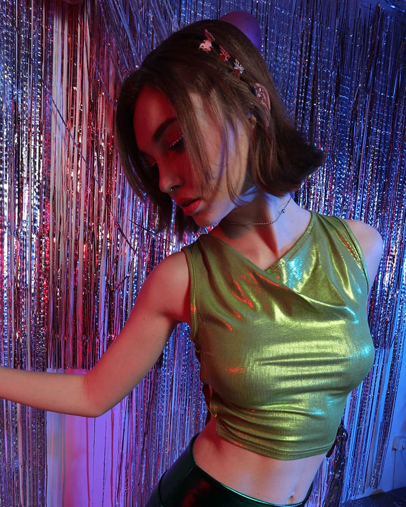 Details: Green crop top with cowl neck and shiny fabric that shimmers during party