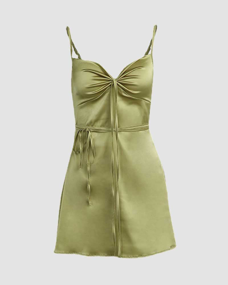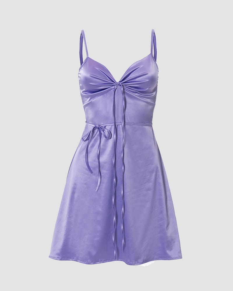 Details: Lilac silky-feel cami dress with ribbon designs at the waistline & chest
