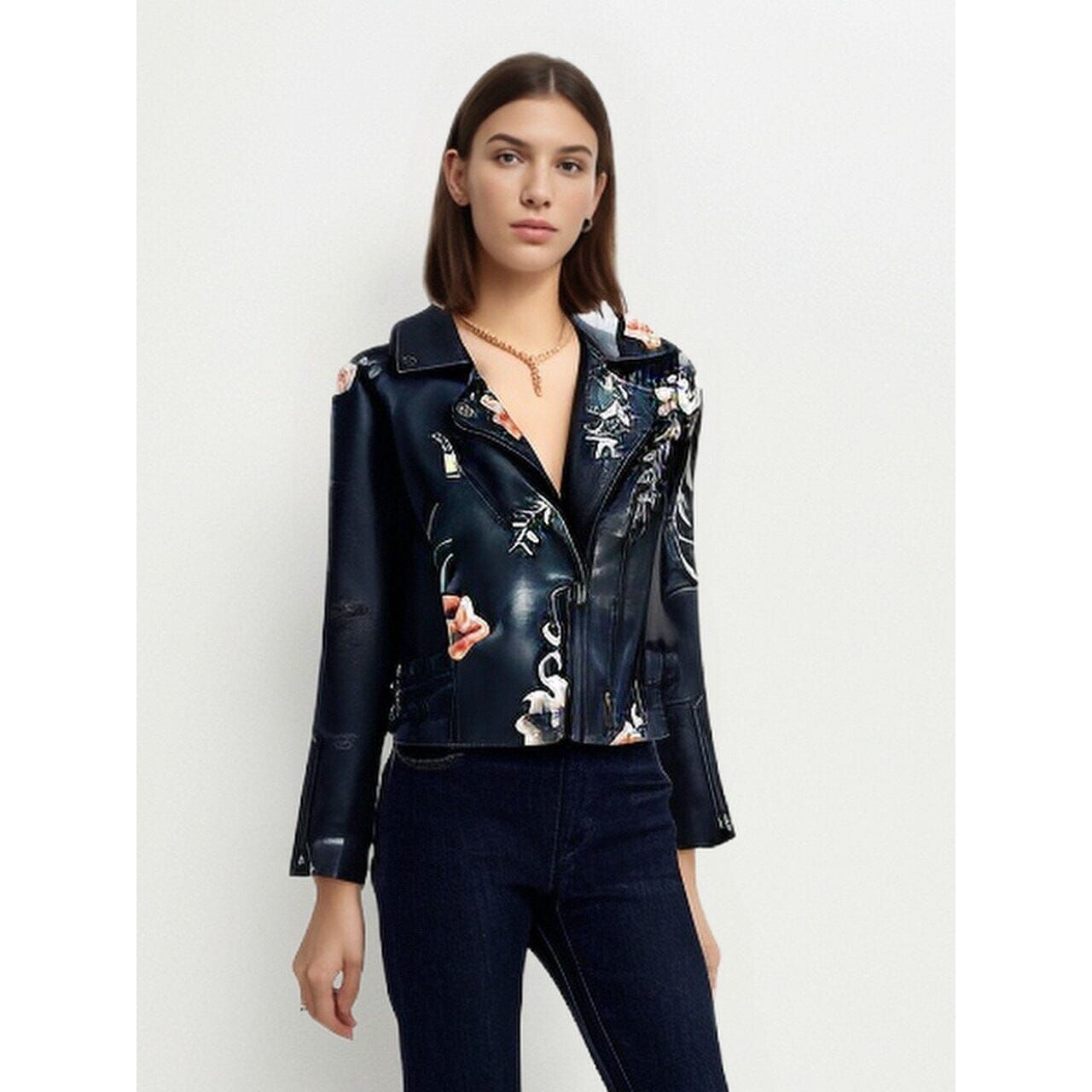 Offering vintage styling and superior comfort. the "Francis" long sleeve faux leather motorcycle jacket is an absolute must-have for any wardrobe. Featuring a luxurious faux leather exterior. front and sleeve zipper accents. and intricate embroidered floral design. Arrive in style this season.