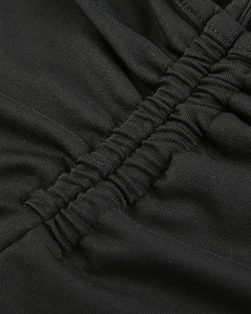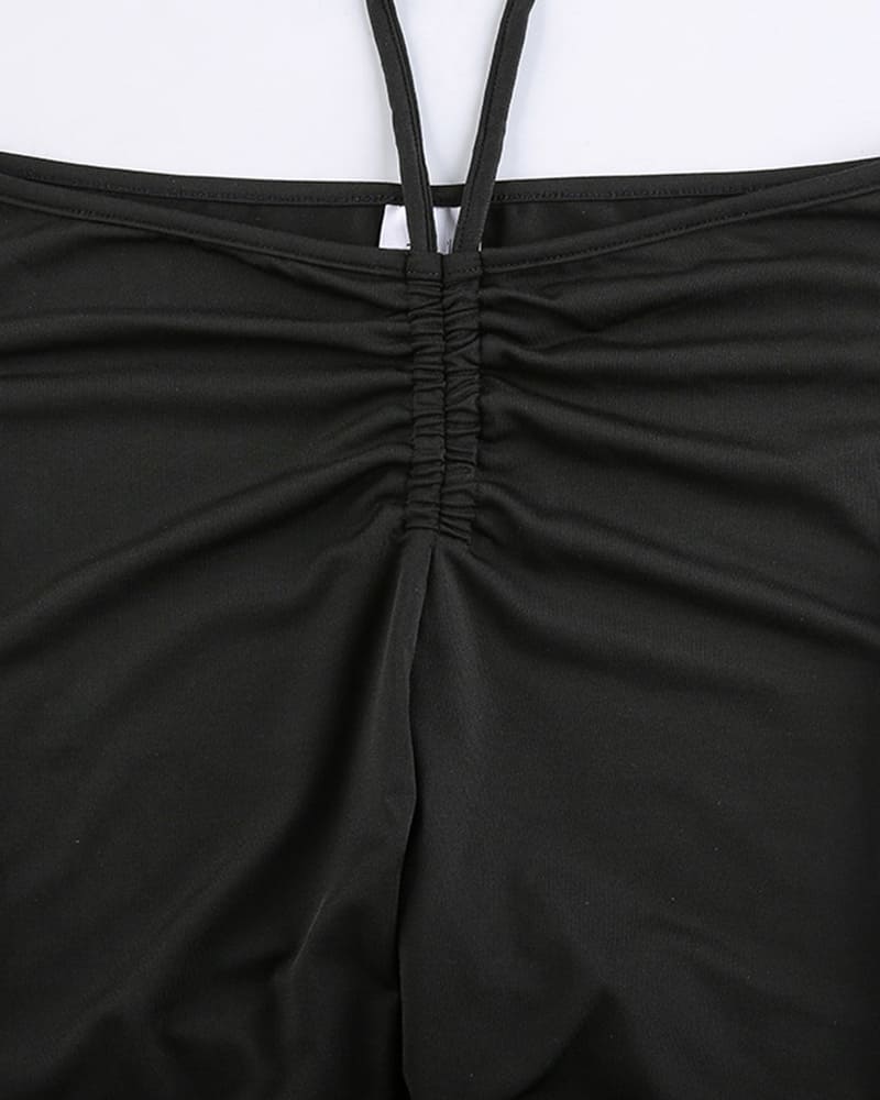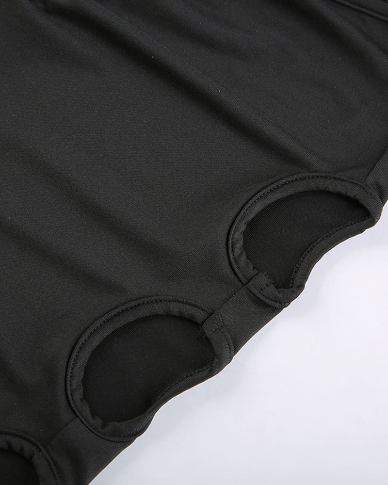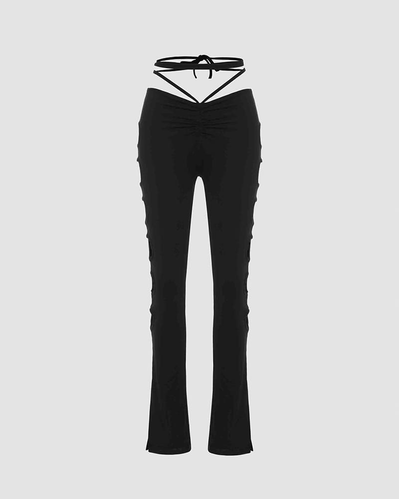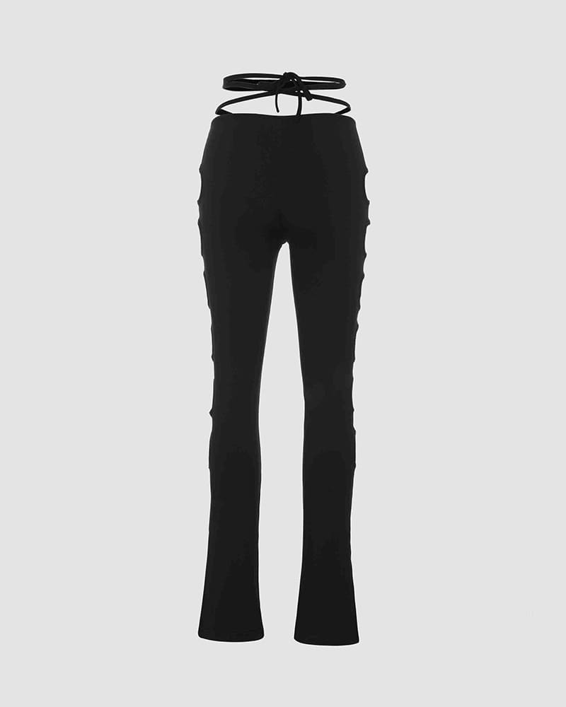Details: High waisted trousers with strings & round cut out patterns at sides